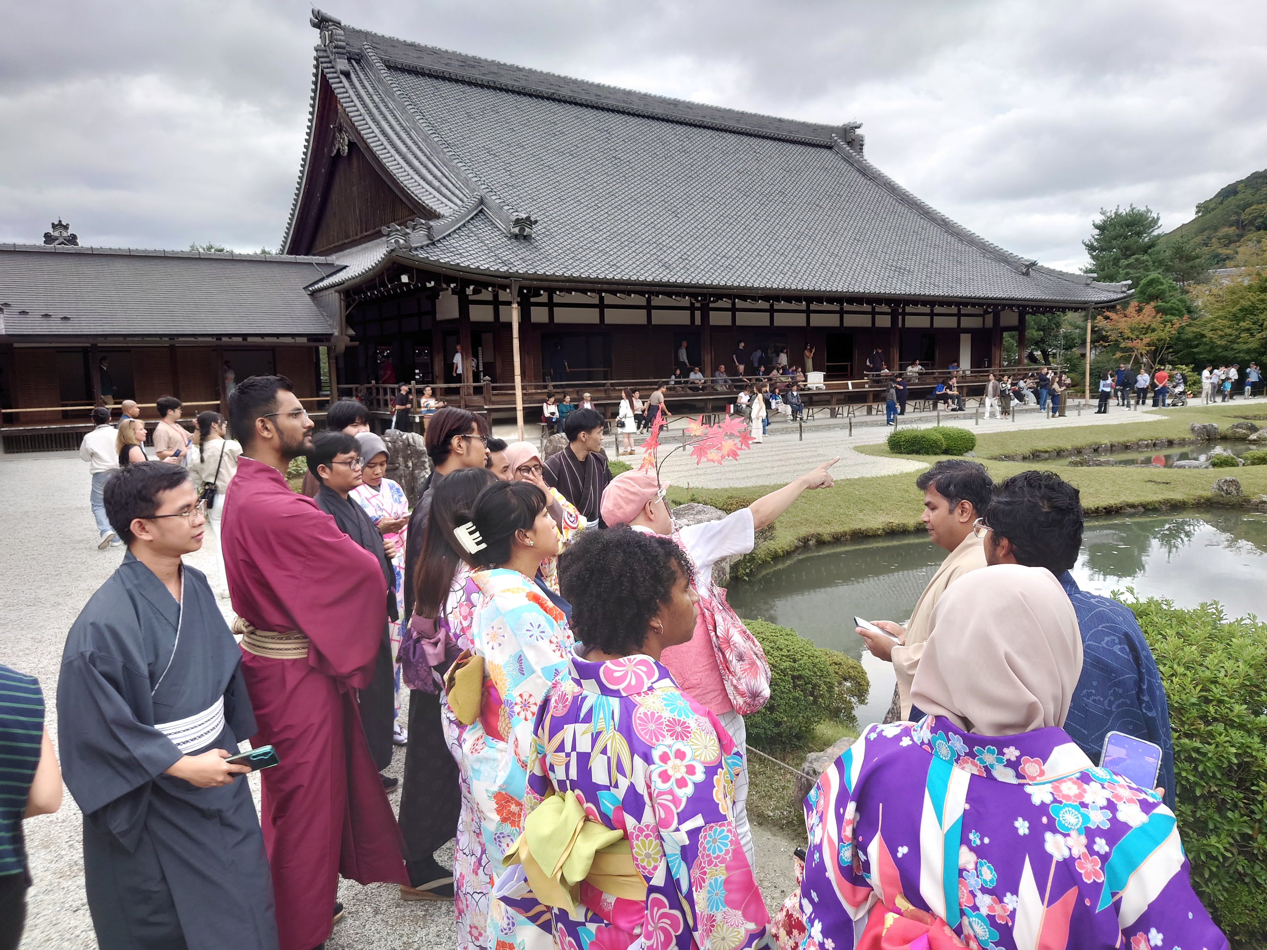 Forty-three international students experienced dressing in a Kimono, Japanese traditional ethnic costume, in Arashiyama, Kyoto. They then strolled along the Bamboo Grove Path, a scenic spot in the same area, while wearing their kimono. Although some students seemed slightly hesitant in the unfamiliar straw sandals, the experience was a valuable opportunity to engage with Japanese history directly. They also visited the historic temple Tenryū-ji in Arashiyama. Through viewing not only the main hall but also the Sōgen-chi Garden and the dry landscape garden, they learned about Japan's national culture, which developed from the Heian period through the Muromachi period.