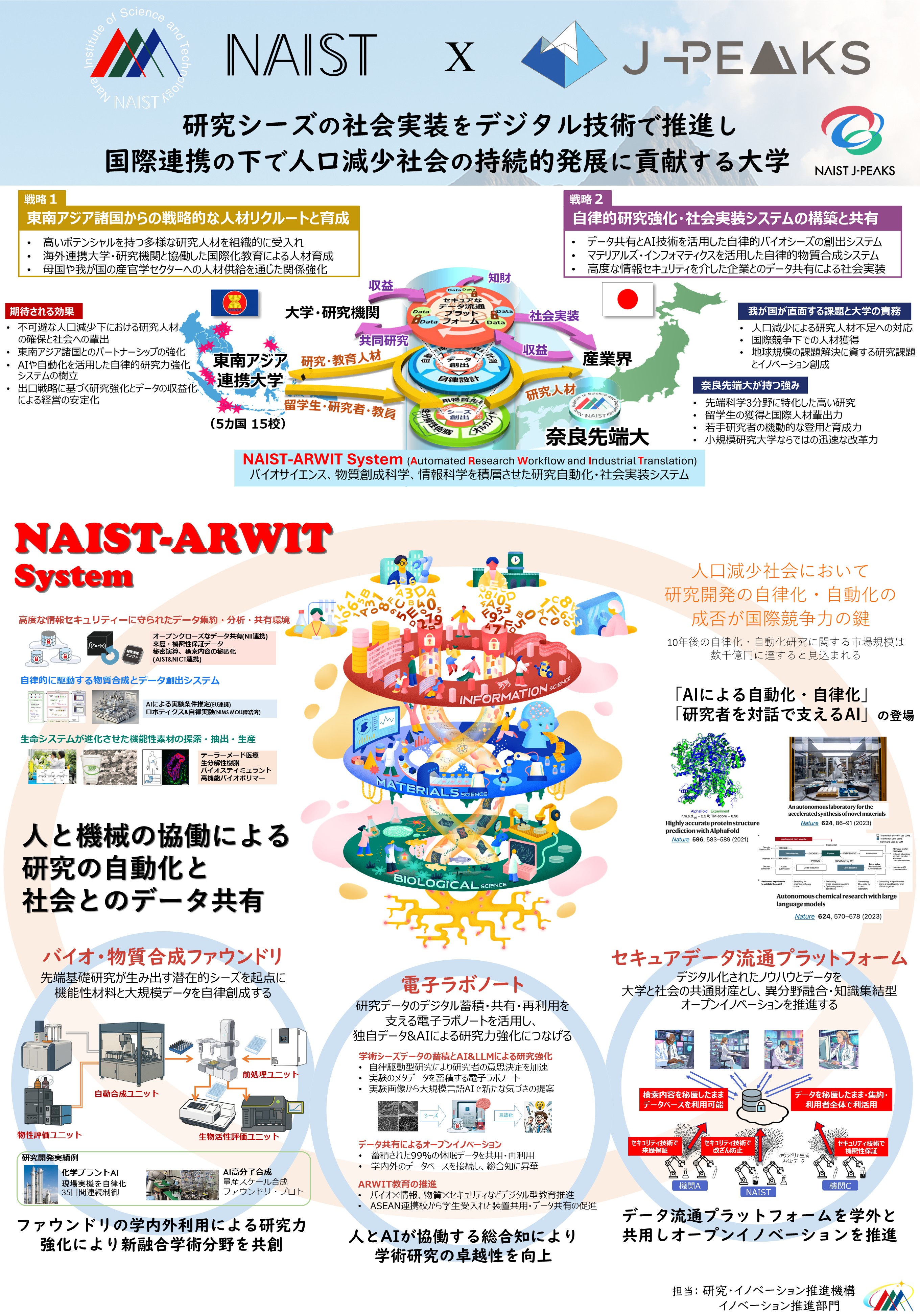 国内外のJ-PEAKS参画機関とも連携し、10年後の未来を見据えてNAISTが提案する「自律的研究強化・社会実装システム」(ARWIT)について、「ARWIT推進センター(2026年1月設置予定)」の一翼を担います。オープン&クローズのセキュアな次世代研究・社会実装システムの社会展開に寄与します。