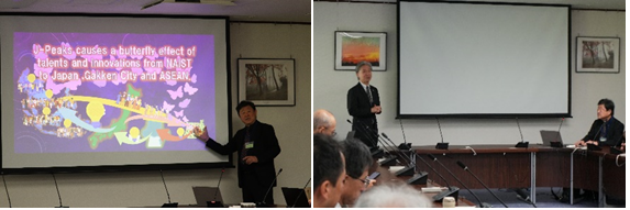 まず、TAKASAGO研修ホールにおいて、塩﨑一裕学長より開会の挨拶、本学の紹介及びJ-PEAKS事業の概要説明を行いました。続いて、本事業で取り組む2つの戦略について真木壽治特任教授、上久保裕生教授及び林優一教授より、J-PEAKS事業の推進体制と組織改革、担当サポーターからの事前確認事項に対する回答について塩﨑学長より説明をしました。