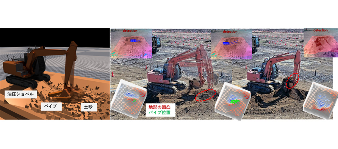 自然災害現場などの過酷な環境で活躍する建設ロボットは、遠隔操縦を基本としますが、自動掘削の機能が搭載されれば、応急復旧の効率が大きく飛躍することが期待できます。しかしながら、自然災害現場には、掘削する対象に、掘削の障害となるものが埋まっている可能性が大きいです。例えば、本プロジェクトが対象とする河道閉塞(大雨や地震の後に崖崩れが発生し、川の流れがせき止められてしまう現象)現場には、倒木が埋まっている可能性もあり、掘削動作を妨げる可能性があります。そこで、本研究では、建設ロボットによる地面の掘削中に、倒木に見立てたパイプを地中に発見した際、これを排除する動作を行うことが可能な自動掘削 AI を開発しました。