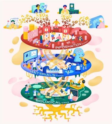 本学のJ-PEAKS事業を広く認知していただくため、ロゴマークを作成しました。このロゴマークは、本学が擁する先端科学3分野の成果と技術を融合し、研究力の強化から社会実装までを一貫して推進する「NAIST-ARWITシステム(自律的研究強化・社会実装システム)」のコンセプトをモチーフとしています。赤・青・緑の3色は、情報科学(赤)/物質創成科学(青)/バイオサイエンス(緑) を象徴しています。内側から外側へと広がっていく形状は、本学のJ-PEAKS事業による取組が、国内外の研究機関や社会へと拡がっていくことを表現しています。